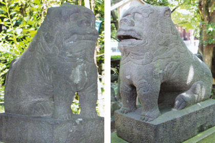 当社の狛大は、延宝3年(1675)6月建立の銘があり、都内の神社に現存する石造狛大では最も古い(都内最古は目黒不動尊で承応3年〈1654〉銘)。現在地に移転される前に奉納されたものと思われる。左右とも頭頂部に窪みがあり、角や宝珠があった痕跡と言われている。大きさは向かって左が51センチ、右が49センチで、前後の長さはともに65センチ、正面の幅は36センチ。