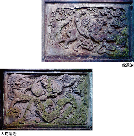 石門の左右の彫刻は唐代の故事集『蒙求』の一節「周処三害」に記された虎退治と大蛇退治の場面。周処という乱暴狼藉を働く若者が、南山に住む白い額の猛虎、舟人を襲う大蛇と並んで自らも村の「三害」と恐れられていたことを知ると、猛虎と大蛇を退治し、志を立てて更生した。結果、猛虎・大蛇・周処の三害が滅ぼされたという。