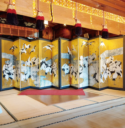 六曲一双の屏風は江戸琳派の作として伝わっており、金箔地には水辺に集う七十羽を超える鶴が描かれている。水は心田の豊穣と水徳を、群鶴は千客万来、子孫繁栄を表している。また、水は亀を見立てているとされ、「鶴は千年、亀は万年」を寿ぐ。この種の屏風は婚礼などの盛儀の際に誂えられることが多く、華やかさとめでたさを強調する構図となっている。