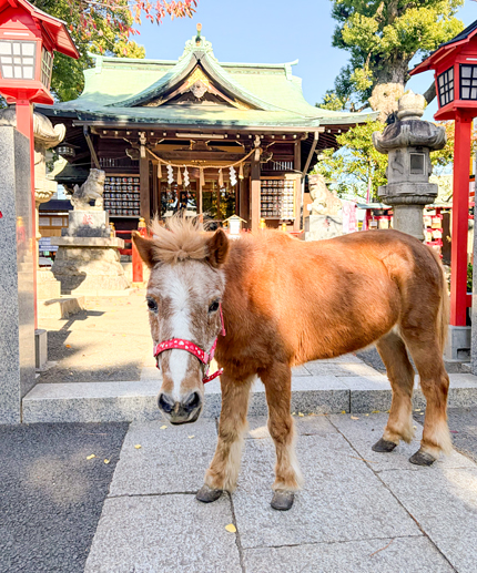 その中において、葛飾区熊野神社にはシェットランドポニーの「きらら号」(写真)、ミニチュアポニーの「ちょこ号」、日本ポニーの「ばにら号」の三頭の可愛らしい北海道生まれの神馬がいる。